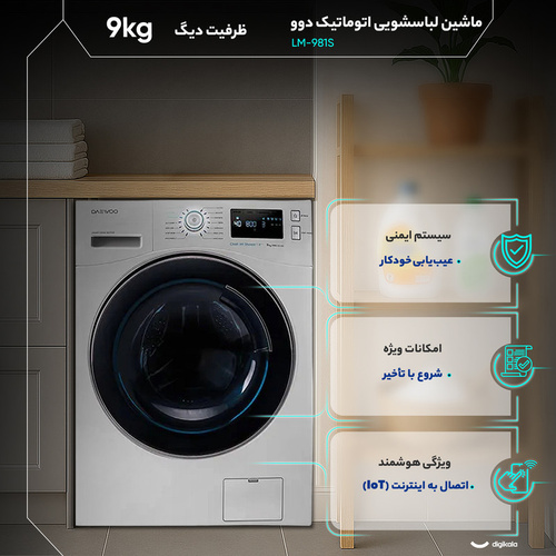 خرید اینترنتی ماشین لباسشویی 9 کیلوگرم اتوماتیک دوو مدل LM-981S با رنگبندی نقره ای به همراه مقایسه، بررسی مشخصات و لیست قیمت امروز در فروشگاه اینترنتی دکورایران