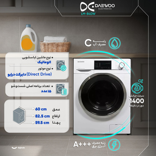 ماشین لباسشویی دوو مدل LM-840W با ظرفیت 8 کیلوگرم یک انتخاب مناسب برای خانوادههای متوسط و کسانی است که به دنبال دستگاهی کارآمد، با عملکرد بالا و مصرف انرژی کم هستند. این مدل از طراحی ساده و مدرن برخوردار است و با ویژگیهای متنوع خود میتواند نیازهای مختلف شستشوی شما را برآورده کند. ماشین لباسشویی دوو مدل LM-840W با نمودار مصرف انرژی A+++ یکی از کارآمدترین مدلها از نظر مصرف برق است. این ویژگی باعث میشود که با استفاده از آن، هزینههای انرژی کاهش یابد و عملکرد بهینهای در طول زمان داشته باشید. همچنین، موتور این دستگاه از نوع دایرکت درایو (Direct Drive) است که موجب کاهش سروصدا و لرزش در حین شستشو میشود. این ماشین لباسشویی دارای سرعت چرخش موتور 1400 دور در دقیقه است که برای شستشوی سریع و مؤثر لباسها بسیار مناسب است. ظرفیت 8 کیلوگرم دیگ دستگاه هم برای شستشوی تعداد زیادی لباس به طور همزمان مناسب و برای خانوادههای متوسط یا افرادی که نیاز به شستشوی حجم زیادی از لباس دارند، ایدهآل است. ماشین لباسشویی دوو مدل LM-840W به 15 برنامه شستشوی مختلف مجهز است که شامل حالت شستشوی سریع، لکه بری و حالت شستشوی با بخار است. این ویژگیها به شما این امکان را میدهند که بسته به نوع لباس و میزان کثیفی آنها، بهترین برنامه شستشو را انتخاب کنید. همچنین، قابلیت تنظیم دما به شما این امکان را میدهد که برای شستشوی انواع لباسها، دمای آب را مطابق با نیاز خود تنظیم کنید. این دستگاه همچنین دارای سیستم تأخیر در شستشو است که به شما این امکان را میدهد که زمان شروع شستشو را به تأخیر بیندازید و طبق برنامهریزی خود عمل کنید. طراحی درب این دستگاه به سمت چپ باز میشود که در صورت نیاز به دسترسی راحتتر به محفظه شستشو مفید است.